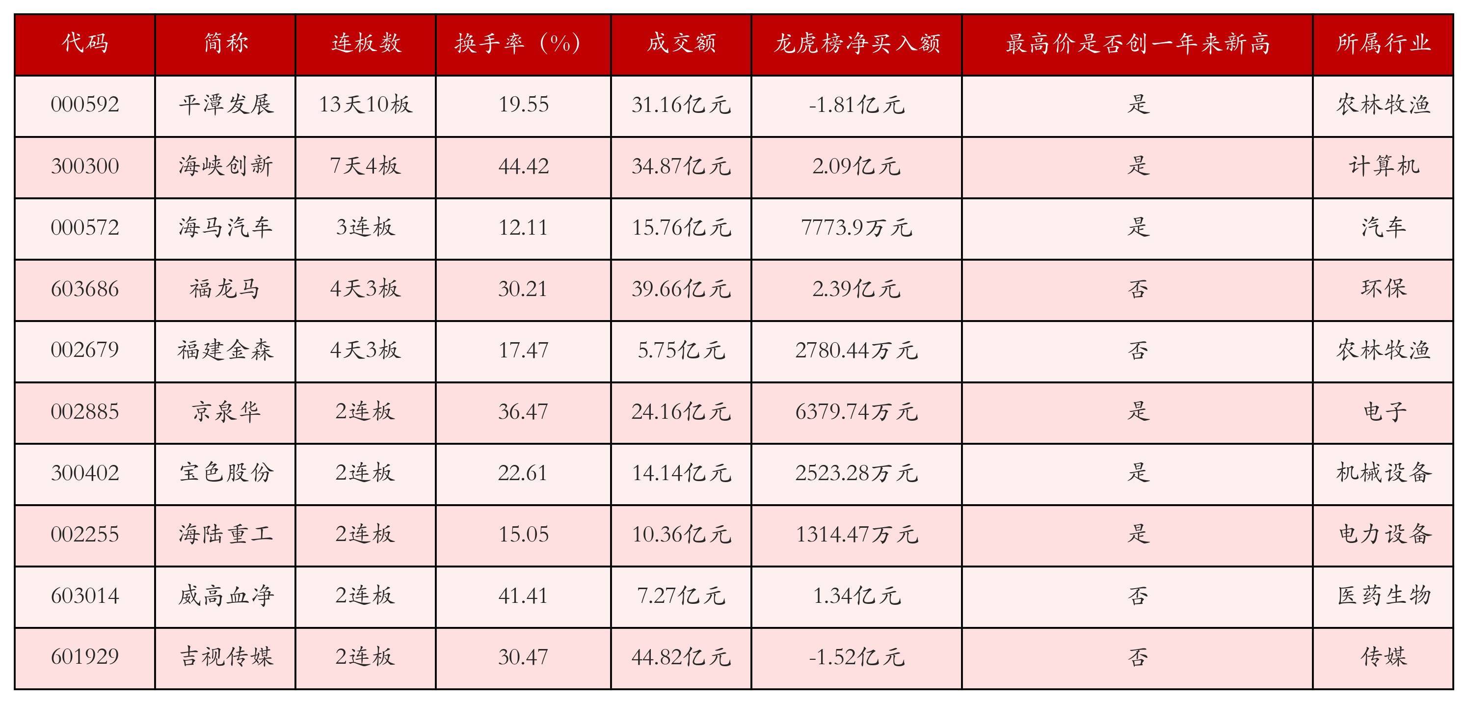 截至11月4日收盘,上证综指下跌0.41%,收于3960.19点,深证成指下跌1.71%,收于13175.22点,创业板指下跌1.96%,收于3134.09点。今日沪深两市A股共计67只涨停,综合当前连板数以及当日龙虎榜数据,其中较为强势的前三只个股分别为:平潭发展(000592)、海峡创新(300300)与海马汽车(000572)。今日强势个股前10位具体数据见下表: