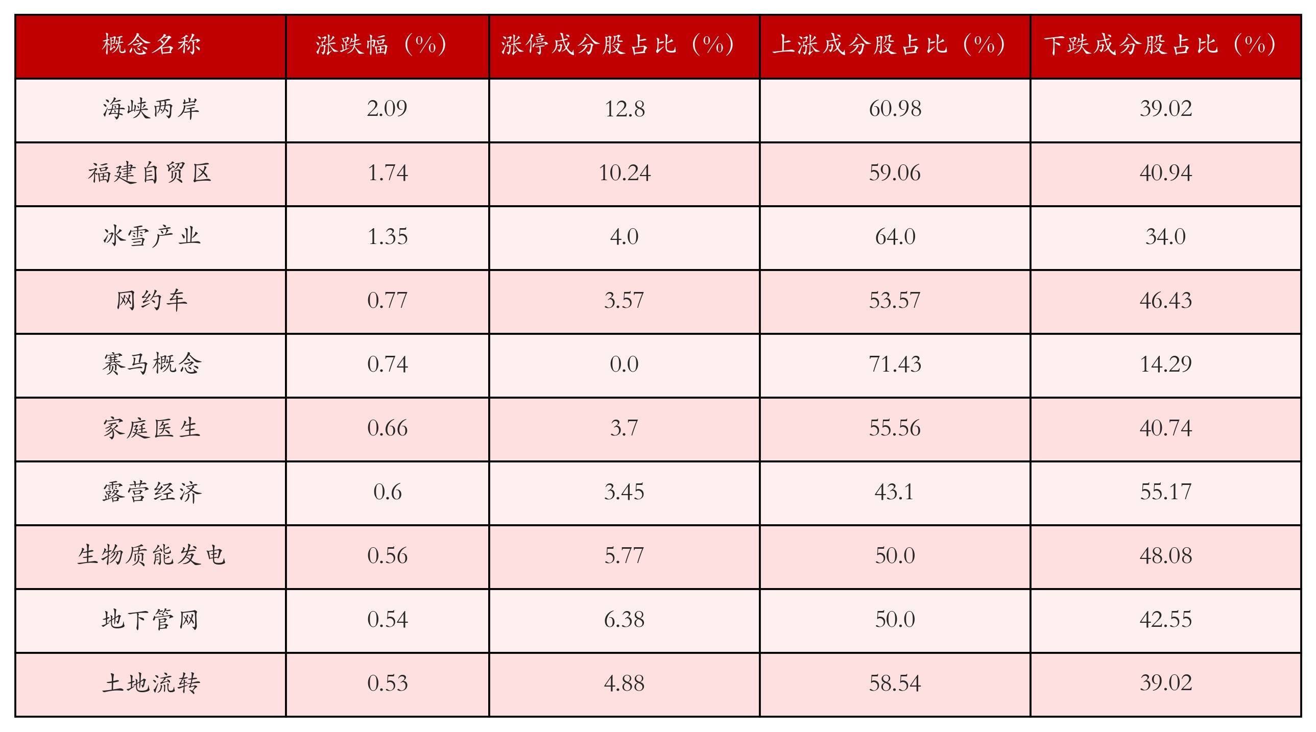 根据A股概念涨跌幅与所对应的股票池综合分析,涨幅靠前的三个概念板块分别为:海峡两岸、福建自贸区与冰雪产业。排名前10位的概念板块相关数据见下表: