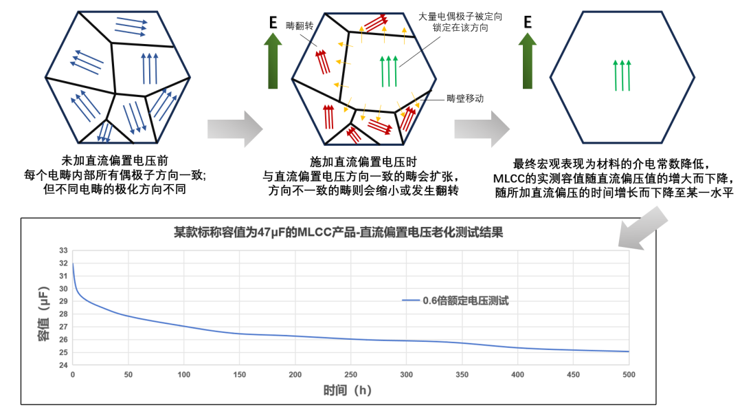 一是直流偏置电压老化测试(DC-Aging)作为MLCC行业较新的测试方法,因缺乏统一标准,导致操作流程不统一、测试数据可比性差。当对MLCC施加直流偏置电压时,其内部的铁电介质(如钛酸钡)会发生显著的微观重构。直流电场提供了一个稳定的极化方向,迫使材料中原本杂乱无章的铁电畴发生重新排列,使得材料的介电常数降低,从而导致器件的实测电容值随时间逐渐下降。