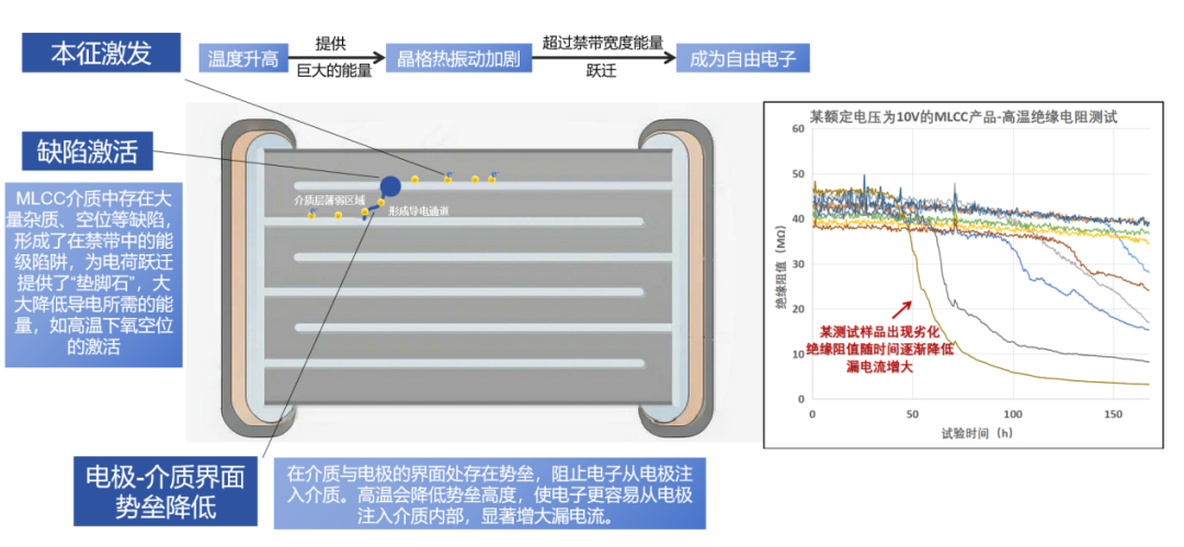二是国内在MLCC长周期高温绝缘电阻测试方面始终缺乏明确规范。高温不仅通过“本征激发”使电子跃迁到导带形成电子漏电流,更主要的是激活了材料缺陷(如氧空位),一方面使其能辅助电子导电,另一方面带正电的氧空位自身也能迁移形成离子漏电流,同时高温还会降低电极与介质间的势垒,导致电子注入,多种机制共同作用致使MLCC产品的绝缘性能在高温工作环境下可能会出现逐渐下降的趋势。