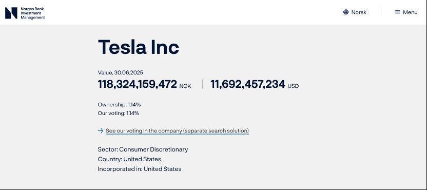 该基金是全球同类基金中规模最大的一家,同时也是特斯拉的第七大单一股东。官网显示,该基金持有特斯拉1.14%的股份。该项投资的价值约为1183亿挪威克朗(约合117亿美元)。
