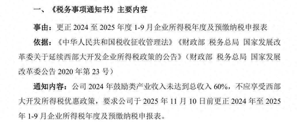 《税务事项通知书》指出,药易购2024年鼓励类产业收入未达到总收入60%,不应享受西部大开发所得税优惠政策。公司需于2025年11月10日前更正2024年至2025年1至9月企业所得税年度及预缴纳税申报表。